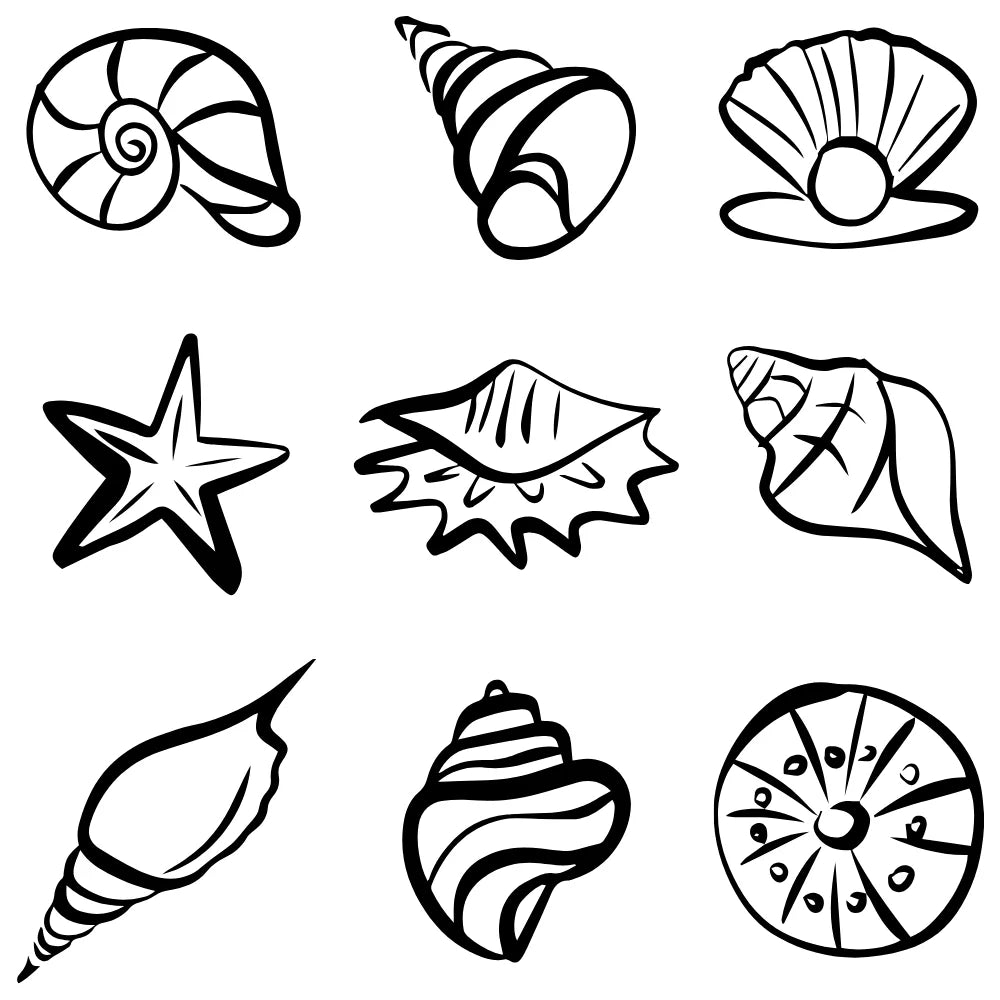 • Detailed sketches including a starfish, a pearl-bearing scallop, and various spiral conch shells