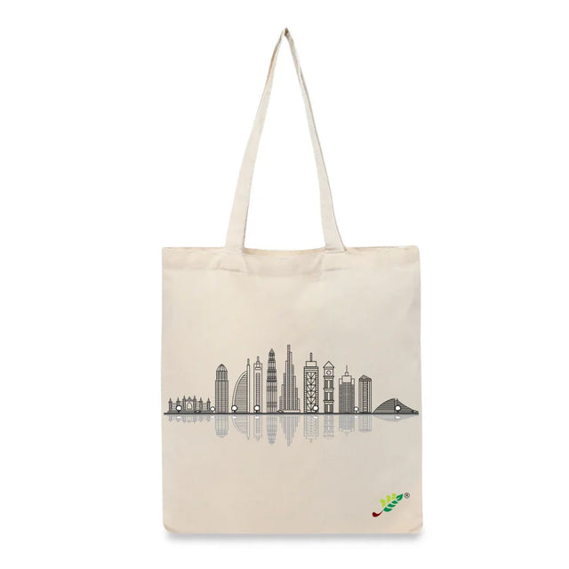 BYFT Modern Cityscape Tote Bag – Dubai Skyline Line Art Printed Reusable Tote | Eco-Friendly Daily Carry Bag (Set of 1)