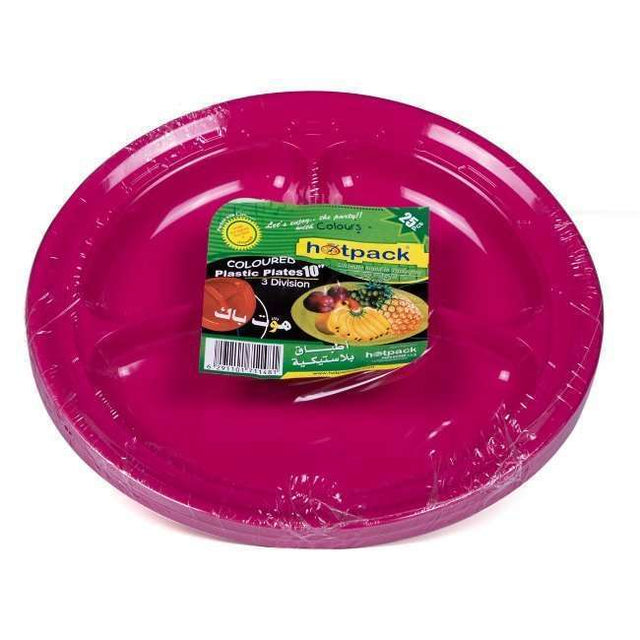 طبق بلاستيكي من هوت باك، مقاس ١٠ بوصات، ٣ أقسام، متعدد الألوان - ٢٥ قطعة | أطباق حفلات
