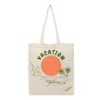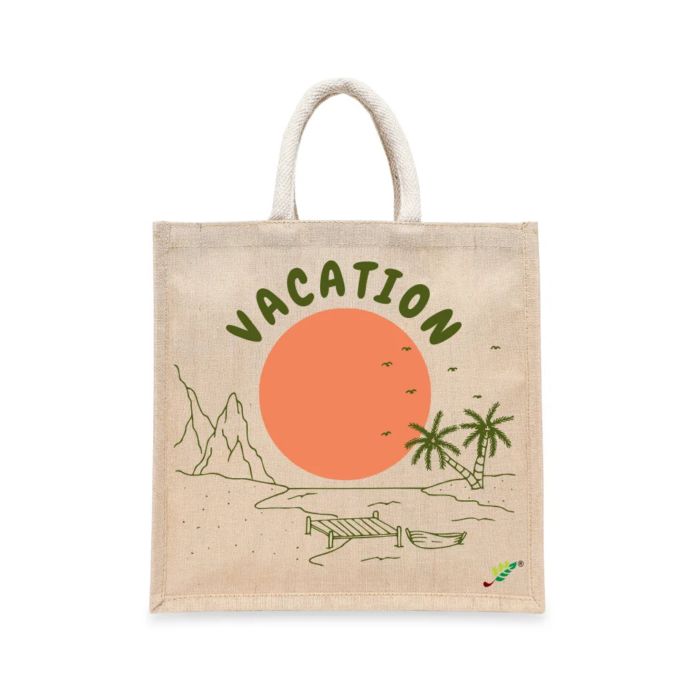 Step into paradise with the BYFT Vacation Printed Tote Bag, your perfect companion for sunny getaways and daily errands. This beautifully illustrated design captures the essence of a serene tropical retreat, featuring a large, vibrant orange sun setting behind a tranquil beach scene. The artwork includes charming line-art details of twin palm trees, a quiet wooden dock, a small boat on the shore, and rugged coastal cliffs. Topped with the word "VACATION" in a playful, curved green font, this bag radiates a relaxed, adventurous energy that makes every day feel like a holiday.