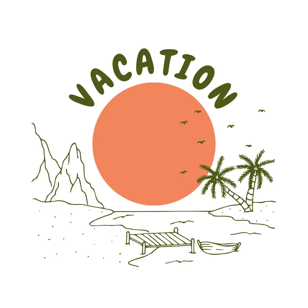 - Scenic “Vacation” design featuring a vibrant orange sun and a detailed tropical beach landscape