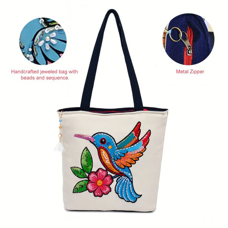 The Purani Jeans Artistic Bird & Floral Print Cotton Tote Bag | Eco-Friendly Reusable Shopping Bag