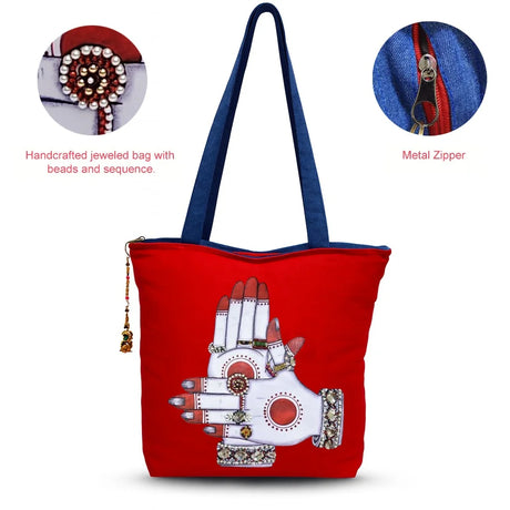 The Purani Jeans Dance of the Hands Tote Bag Red | Handmade Artistic Denim Carry Bag