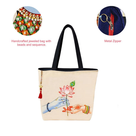 The Purani Jeans Radha Krishna Lotus Tote Bag | Off-White Denim Handmade Artistic Carry Bag