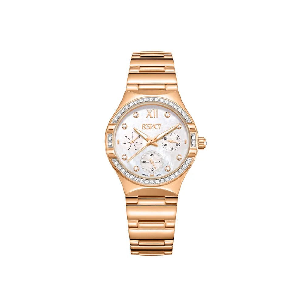 ساعة إكستاسي النسائية بحركة 6P29، شاشة متعددة الوظائف وسوار من الفولاذ المقاوم للصدأ - E23608-Rbkmk، لونان من الذهب الوردي