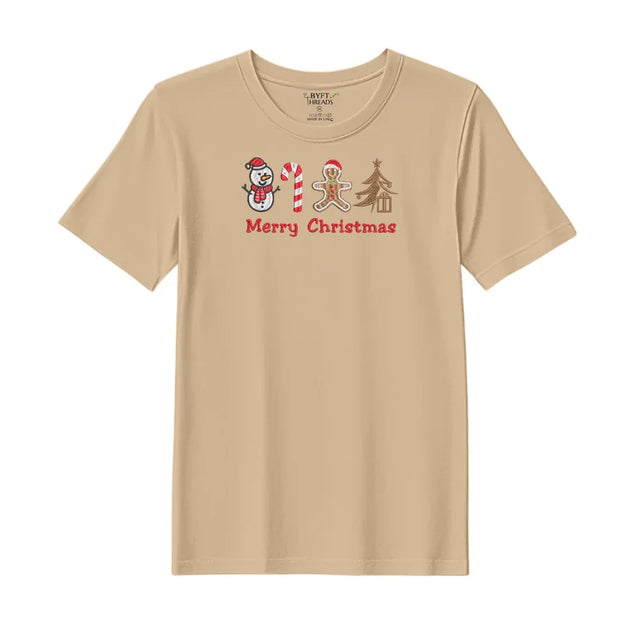 BYFT Threads Embroidered For You Christmas - Merry Christmas Icons (Snowman + Candy Cane + Gingerbread + Tree) Designed T-Shirts