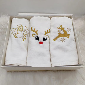 Celebrate the season with the BYFT Embroidered For You Personalised Christmas Towel - Christmas Trio Set Design. Featuring three festive motifs a cheerful Snowman, a cute Reindeer Face, and a elegant Leaping Reindeer with Snowflakes this towel adds joyful holiday charm and makes a perfect Christmas gift.