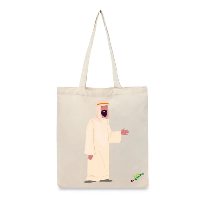 Celebrate the blend of tradition and modern lifestyle with the BYFT Urban Nomad Printed Tote Bag. This artistic accessory features a detailed illustration of a man dressed in traditional Middle Eastern attire, including a classic cream-colored kandura and a neatly styled ghutra with an agal. With a warm, welcoming smile and a friendly open-hand gesture, the design embodies the spirit of hospitality and cultural pride. Ideal for local residents and travelers alike, this durable and eco-friendly carryall is the perfect choice for showing your appreciation for regional heritage while running daily errands or attending cultural events.