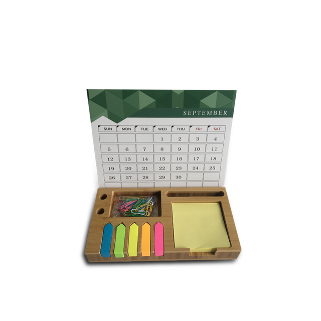 • A bamboo desktop organizer with 350gsm art paper printed calendar and bamboo mouse pad.